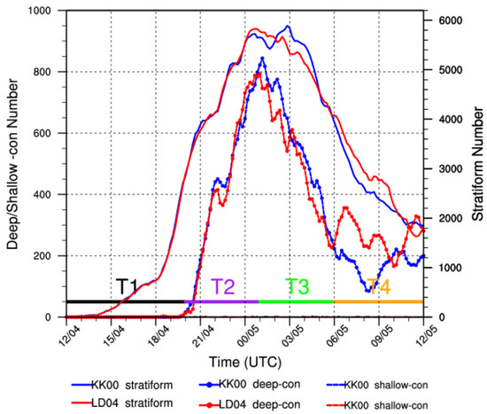To eliminate the statistical error caused by an inconsistent grid, any times with fewer than twenty grids are regarded as missing times (the total number of grids is 42,675 throughout the statistically analyzed region). It is clear that almost no shallow-convective grids are generated during the entire lifecycle; therefore, they are not analyzed in this paper. Morphologically, the evolution trends are in line with those of the RR (Figure 3b). The stratiform grid numbers between the two simulations are different in four stages: before 0000 UTC on 5 July, there is no significant difference; from 0000 to 0200 UTC on 5 July, the number of grids in LD04 exceeds that in KK00; from 0200 to 0600 UTC on 5 July, the number of grids in LD04 is less than that in KK00; then, the number of grids in LD04 is greater than that in KK00 after 0600 UTC on 5 July. The differences in the deep-convective numbers, similarly, have four stages, which are marked as T1–T4 in Figure 8. The eight hours (1200 to 2000 UTC on 4 July) after the WRF model is initialized are the initial spin-up stage, during which there are almost no deep-convective grids. The second stage from 2000 UTC on 4 July to 0100 UTC on 5 July is the growth stage, in which the convective echoes strengthen gradually and the deep-convective number increase rapidly; however, the difference between the two simulations is small. The third stage from 0000 to 0600 UTC on 5 July is the dissipation stage, in which the echoes weaken and the deep-convective grid number decreases, with that of the LD04 simulation being less than that of KK00. In the fourth stage after 0600 UTC on 5 July, depending on the new echoes in eastern Hubei, the weakened system redevelops to generate more deep-convective clouds, with the number of deep-convective grids in LD04 exceeding that of KK00.