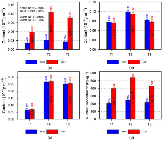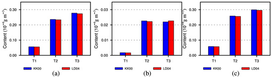 Compared with the KK00 simulation, the ACR content in the LD04 simulation is greater in all stages so that the LD04 simulation always has a smaller regionally averaged Lc and a larger regionally averaged Lr and Nr. The ACR content in the LD04 simulation is 280% to 405% of that in KK00; Lc reduces to 93% to 97% of that in KK00; and Lr and Nr increase to 102% to 103% and 195% to 221%, respectively, so that ACR has a larger effect on Nc than Lc. Moreover, the ACR content in the two simulations gradually increases and then decreases, as the RR does (Figure 8a). At the T2 stage, ACR increases rapidly, and the ACR content in the KK00 (LD04) simulation increases to 148% (212%) of that in the T1 stage. In the T3 stage, however, ACR decreases slowly and the ACR content in the KK00 (LD04) simulation decreases to 84% (86%) of that in the T2 stage, which indicates that ACR more heavily influences raindrops in the growth stage. This is similar to the results of Li et al. [22], who found that ACR plays a major role in the early stages of warm-rain-cloud precipitation. However, given the results presented in Figure 7 and Figure 8, the impact of ACR on Meiyu frontal rainfall exists throughout the entire MCS evolution, not only in the early stage.