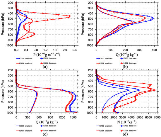 Figure 11 shows the vertical profiles of the time- and regionally averaged ACR rate, Qc, Qr, and Nr. In stratiform clouds, the upper peak height of the ACR rate in LD04 and the only peak height in KK00 lie at 550 hPa, the peak value in LD04 is about three times that of KK00, and the lower peak height in LD04 lies at 700 hPa. In deep-convective clouds, the peak height of the ACR rate is at a higher altitude caused by the higher altitude that the updraft in the convective cloud reaches. The upper peak height of the ACR rate in LD04 and the only peak height in KK00 exist at 450–500 hPa, the peak value in LD04 is about 5.5 times that of KK00, and the lower peak height in LD04 lies at 800 hPa. Besides that, the Nr in the LD04 deep-convective clouds achieves two peaks as the ACR rate does; this may be because ACR influences the Nr more so the two-peak characteristic is reflected in the Nr of deep-convective clouds.