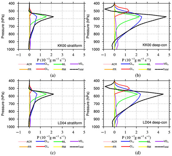 The prefix “dif-” is used to represent the differences hereafter; for example, “dif-ACR” indicates the value of the ACR rate in LD04 minus the ACR rate in KK00. In stratiform clouds, from 400 to 550 hPa, the dif-Total rate is negative, and dif-CLcr and dif-CLri are the dominant terms; below 550 hPa, there are positive dif-CLcr, dif-ML, and dif-VDrv rates. The dif-CLcr rate in LD04 contributes the most at most altitudes, resulting in a positive dif-Total rate, meaning more raindrop production in the stratiform clouds compared with KK00, which are consistent with the regional average results (Figure 8c). In deep-convective clouds, dif-CLcr, dif-ML, dif-CLri, and dif-VDrv are still the dominant terms while the dif-Total rate is negative throughout the atmospheric column giving negative dif-CLcr, dif-ML, and dif-VDrv rates. This differs greatly from stratiform clouds. Furthermore, in deep-convective clouds, the dif-ML rate peak exists at about 550 hPa and is greater than the dif-CLri rate; however, below 550 hPa, dif-CLcr (especially) and dif-VDrv become the dominant terms. To sum up, the indirect influences on CLcr (especially), ML, and VDrv by ACR are different to the growth of raindrops in two regions. In deep-convective regions, the smaller CLcr, ML, and VDrv rates in the LD04 simulation compared with those in KK00 are the most critical factors in the smaller Qr.