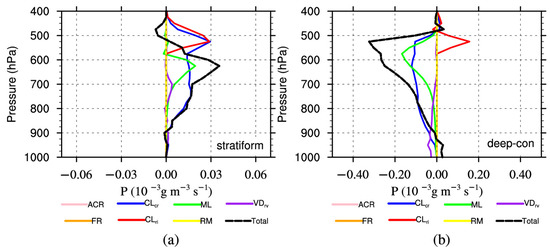 Vertical profiles of time- and regionally averaged rate of the budget differences in (a) stratiform and (b) deep-convective regions at the T2 stage. “Total” refers to the summation of the seven terms.