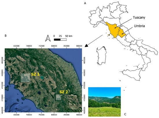Study area in central Italy showing the (A) map of Italy with the Tuscan and Umbria regions highlighted; (B) sampling zones in Tuscany—SZ1, with three sampling sites (N 43.64353° E 011.97958°; N 43.34555° E 11.15181°; N 43.337333° E 11.171333°), and in Umbria—SZ2, with two sampling sites (N 42.4844759° E 12.707810°; N 42.4846855° E 12.707860°); and (C) an image of a sampling site.