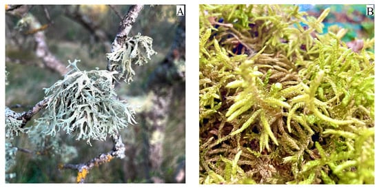Epiphytic lichen species Evernia prunastri (L.) Ach. (A) and epigeic pleurocarpous moss species Pseudoscleropodium purum (Hedw.) M. Fleisch (B).