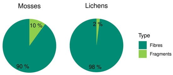 Overall, a total of 154 MPs were found across all subsamples (n = 50) from the five study sites; 62 MPs were found in lichens, and 92 MPs were found in mosses. The vast majority (93.5%) of MPs were classified as fibers, and only 6.5% were classified as fragments (see Supplementary Materials Figure S2). In mosses, the MP proportion consisted of 90% fibers and 10% fragments, while in lichens, it was 98% fibers and 2% fragments (Figure 3).