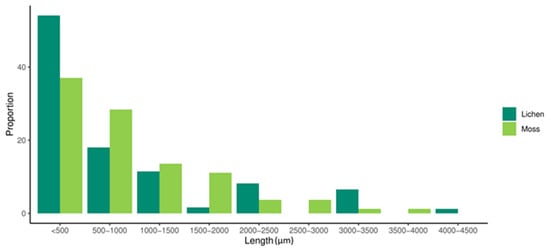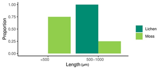 The fiber length distributions ranged from 147–4461 µm in lichens and 139–4075 µm in mosses (Table 1; Figure 4). The fragment length distributions ranged from 500–653 µm in lichens and 292–592 µm in mosses (Figure 5).