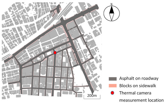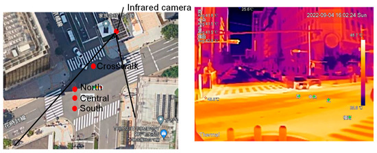 Thermal images were measured using an infrared camera (VOx Uncooled Thermal Sensor, Dahua Technology, Hangzhou, China, TPC-BF2221-T; measurement accuracy: maximum ±5 °C) at 15 s intervals from 23 July to 4 September 2022. Measurement points and example of thermal image are shown in Figure 2. Air temperature, humidity, and solar radiation were also measured from 1 August to 1 September 2022. The measurement point was located on the intersection of a one-way westbound three-lane east–west road and an opposite four-lane north–south road. Air temperature and humidity were measured near the location of the infrared camera, and solar radiation (Thermopile, Tsuruga Electric, Osaka, Japan, LP PYRA03, measurement accuracy: 25 W/m2) was measured on the roof of a building of Kobe University, continuously at one-minute intervals. The sensor of the thermo-hygrometer (Thermistor and polymer membrane resistance type, Espec, Osaka, Japan, Thermo Recorder RS-14, measurement accuracy: average ±0.5 °C, ±5%) was installed in a natural ventilation system that provided shade from the sun and rain. The infrared camera and thermo-hygrometer, which were continuously installed throughout the measurement period, were mounted on a pole about 1 m above the platform, which is about 2 m above the ground. The surface temperature data of vehicles and pedestrians seen in the thermal images were dismissed by checking the images every 15 s.