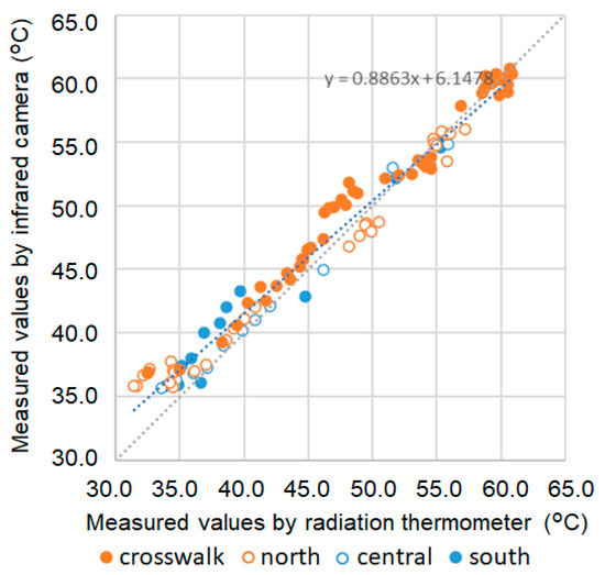To confirm the accuracy of the infrared camera measurements, field measurements were taken with a radiation thermometer at four points (see Figure 2): at the crosswalk, north, center, and south of the subject intersection. Figure 3 shows measurement results of surface temperatures using the radiation thermometer and infrared camera. The radiation thermometer readings were averages of 5 measurements taken at the center and four corners of a 50 cm square at each of the 4 points. The infrared camera readings were the median of the five-minute period immediately before the thermometer readings. To avoid the influence of the thermometer operators and their shadow on the infrared image, data only before the radiation thermometer measurements were used. The data were carefully extracted from 5 min data under stable weather conditions and without the influence of cars. Only measurements unaffected by watering were used. The averaged bias (radiation thermometer–infrared camera) at each location was 0.54 °C at south, 0.61 °C at center, 0.54° C at north, and 0.83 °C at crosswalk. As emissivity was set to 1.0 for both measurement devices, this is considered to be an effect of instrumental difference. Errors are large at low temperatures. We carefully examined the relationship between the relevant pixel in the infrared image and the surface to be measured in the field but could not find a clear relationship with the distance or angle from the infrared camera. However, it is obvious that there is a limitation in the accuracy of the infrared camera image measured from the lateral upper side.