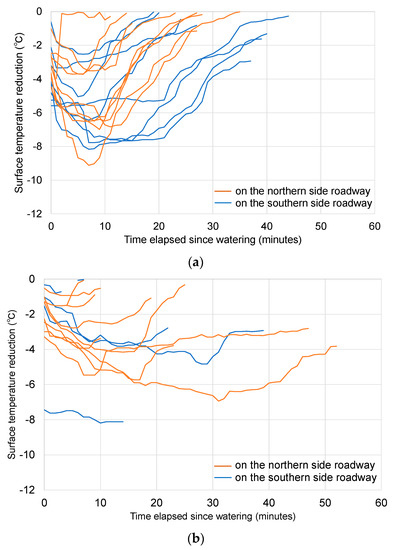 Figure 5. Measured surface temperature decrease immediately after watering at 12:30 p.m. on the north and south lanes of the east–west road, excluding rainy days from July 22 to 4 September 2022. Each line represents a measuring day, and the blue and orange lines represent measuring points. These values were extracted from the results of continuous measurements using an infrared camera. The data show the surface temperature until it returns to the temperature before watering, but if it becomes discontinuous due to the shadow of surrounding buildings or the influence of other watering trucks, the display stops. (a) Sunny days (data from 17 watering events); (b) cloudy days (data from 13 watering events).