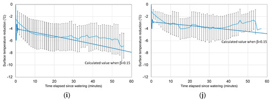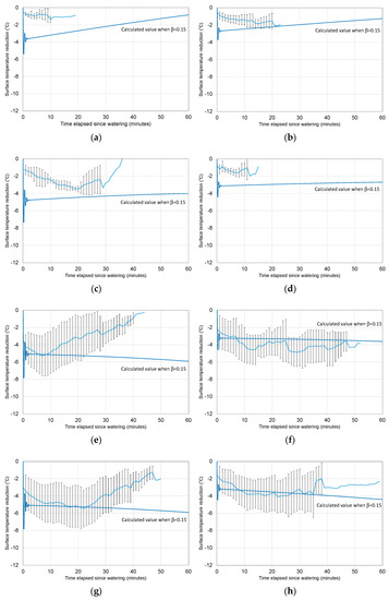 Kato et al. [31] described that, based on field measurements, it took an average of 60 min to return to pre-watering temperatures. As shown in Table 2 and Figure 6, it is often difficult to determine the time it takes to return to the pre-watering temperature from the measurement results. The duration of the surface temperature decrease was short (less than 30 min) for sunny days and long (more than 30 min) for cloudy days. On sunny days, if the evaporation rate was faster and the surface temperature decrease was larger, then the duration of the evaporation was shorter.