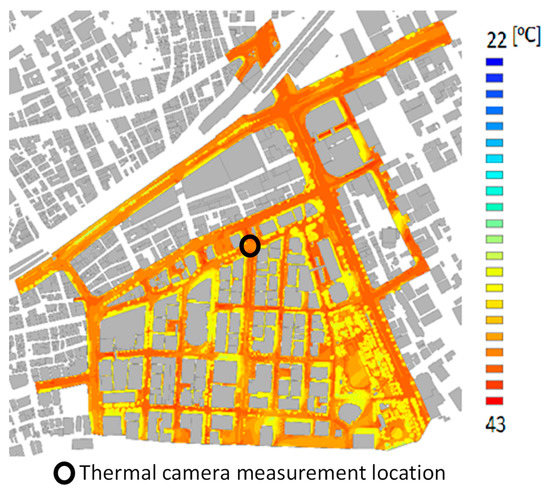 An example of SET* distribution calculation results at 1.5 m high at 13:00 on 5 August 2020 is shown in Figure 7. Ground surface temperature is low in the shaded area by the surrounding buildings and trees. Since daily integral incident solar radiation is small in the shaded streets by street trees, surface temperature is low in both east–west and north–south roads. MRT is low in the median strip in some streets and the central park, where incident solar radiation and surrounding surface temperature are low. SET* is more affected by MRT than wind velocity. The calculation results were validated using the measurement results obtained on sunny summer days [32].