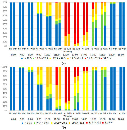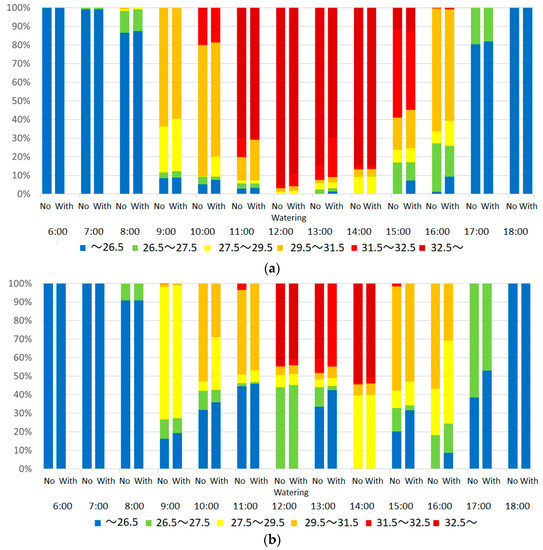 Figure 9. Diurnal variations in spatial distribution frequency of SET* at 1.5 m high on the eastern and western sidewalks of north–south road on 5 August 2020. The left bar is without watering, the right bar is with watering. (a) On the eastern sidewalk of north–south road; (b) on the western sidewalk of north–south road.