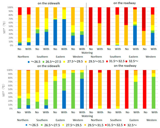 Diurnal variations of spatial distribution frequency of SET* at 1.5 m high on the eastern and western sidewalks on north–south road on 5 August 2020 are shown in Figure 9. The right bar at each time indicates the frequency when the road was watered. On the eastern sidewalk, there are relatively many places that are comfortable (below 29.5 °C) until 11:00 a.m. On the western sidewalk, there are relatively many places that are comfortable after 1:00 p.m. Use of the eastern sidewalk in the morning and the western sidewalk in the afternoon are recommended.