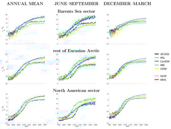 Basically, the selected models reasonably reproduced surface air temperature over the Arctic shelf in comparison to the reanalyses of the NCEP–DOE (National Center for Atmospheric Research–Department of Energy) [] and ERA5 (European Centre for Medium-Range Weather Forecast Reanalysis 5) [], with an error which is within a few degrees centigrade (Figure 1; see also Figure A2 which zooms the years 1950–2020). Thus, these models could be used for our purpose. However, because of the almost two-fold differences in their climate sensitivities (Table 1), they projected quite different regional scale SAT increases in the 21st–23rd centuries. We consider the latter as an additional benefit of our ensemble, because our models sample one of the major uncertainties in climate studies—the uncertainty due to the climate sensitivity to external forcing.