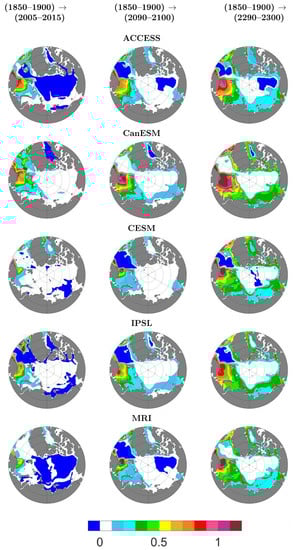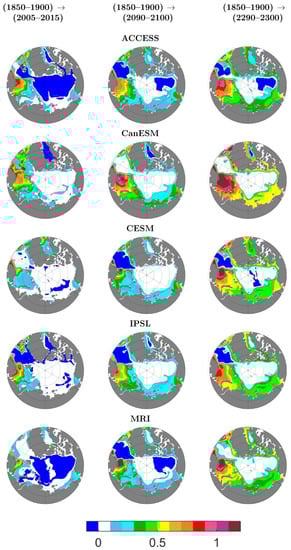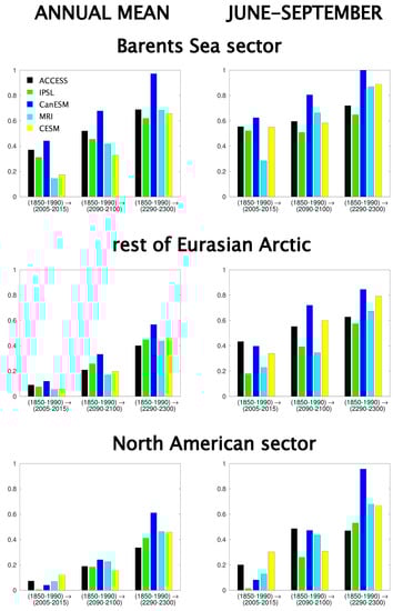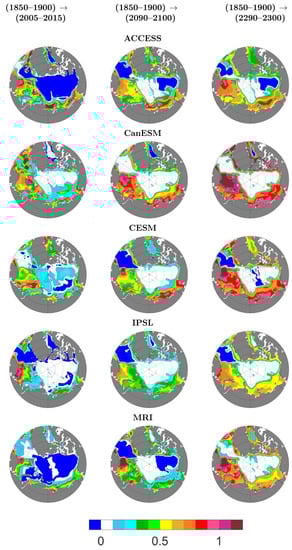 For transitions and, especially for , the sensitivity coefficients became much larger relative to those for the historical period . In particular, for , 3 out of 5 models simulated over vast areas of the Eurasian (both BS and RoE) shelf. This was especially marked for CanESM. Interestingly, with the ACCESS and CESM models, in the Laptev and East Siberian Seas was even larger than its counterpart in the Barents Sea. The sensitivity coefficients increased further for the transition . Here, all 5 models simulated everywhere over the Arctic shelf.