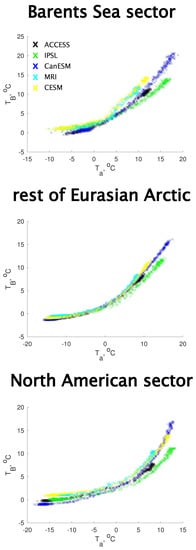 One may consider as a function of . It is clear that this function should depend on the region, on the season, on the calendar year, and on the model. However, for the shelf region-averaged values, the slope of this function showed features that were basically independent from all the above mentioned factors. Namely, this slope was very flat for temperatures below the freezing temperature of the oceanic water and it became much steeper above this temperature (see Figure 6 for annual mean values as an example). In the latter case, this slope stayed close to unity for all the models studied here. Thus, we may hypothesize that the marked increase of our sensitivity coefficients occurred when the shelf region became ice-free in the summer.