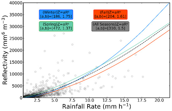 Influence of seasons on the Z–R relationship. Winter includes January and February of 2019, fall includes November and December of 2019, and spring includes March and April of 2020.