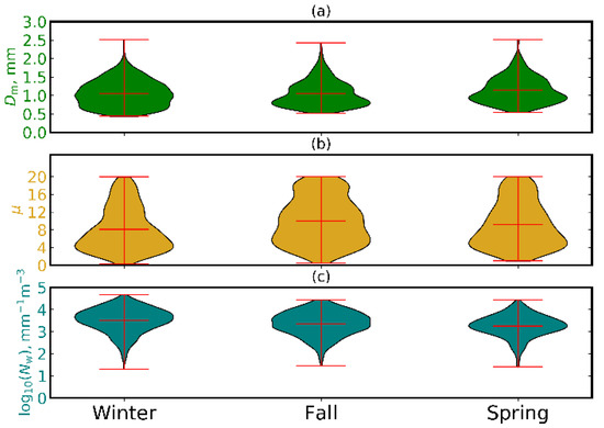 Seasonal influence on distributions of the DSD scaling parameters allocated during the winter, fall, and spring: (a) mean volume diameter; (b) shape; (c) concentration. Maximum, minimum, and average values are included.