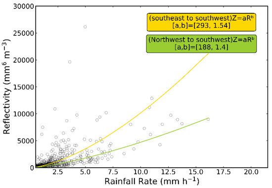 The influence of wind direction on the Z–R relationship. The yellow and green lines indicate the best fit for southwest and northwest flow, respectively.