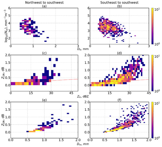 Series of two-dimensional histograms representing the influence of northwest-to-southwest flow and southeast-to-southwest flow on specific radar and DSD parameters: (a,b) vs. for northwest and southwest flow; (c,d) for northwest and southwest flow; (e,f) vs. for northwest and southwest flow.