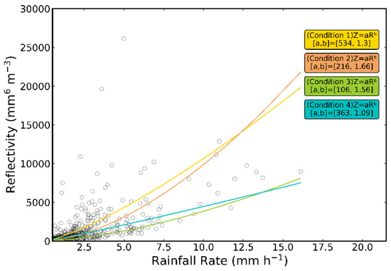 The influence of low-level flow from the northwest and southwest at different magnitudes on the Z–R relationship. The yellow and orange lines represent southeast-to-southwest flow at different magnitudes, while the green and blue lines represent northwest-to-southwest flow at different magnitudes.