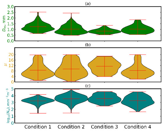 Influence of wind direction on the distributions of the DSD scaling parameters in the form of a violin plot: (a) mean mass diameter; (b) shape; (c) concentration.