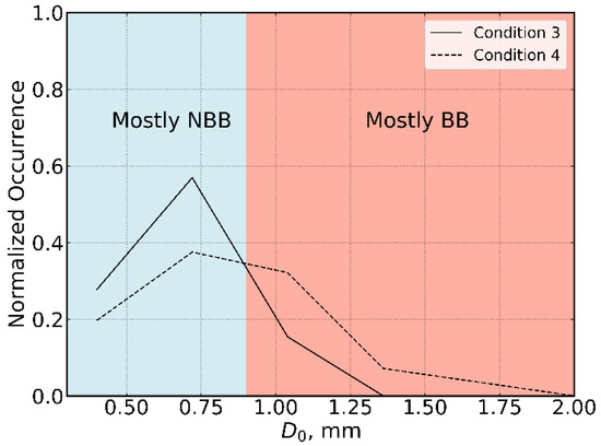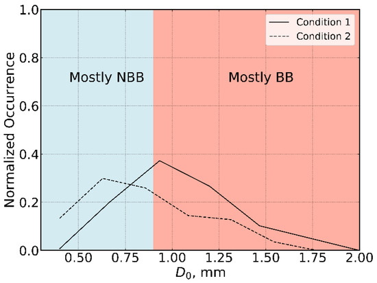 Normalized distribution of for condition 1 (black solid line) and condition 2 (black dashed line). Note that smaller drop sizes ( < 0.90 mm) are associated with mostly NBB, and larger drop sizes ( > 0.90 mm) are associated with mostly BB rain.