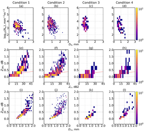 Two-dimensional histograms indicating the influence of wind direction and magnitude on specific DSD and radar parameters: (a–d) vs. for condition 1 through condition 4; (e–h) for condition 1 through condition 4; (i–l) vs. Z for condition 1 through condition 4.