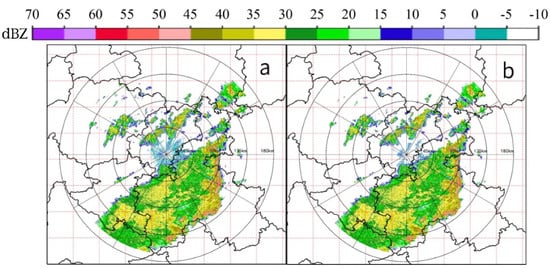 Quality control effect diagram of weather radar base data (a) before quality control and (b) after quality control.