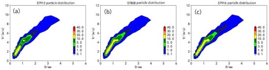 In Figure 2, the horizontal axis is the particle diameter, the vertical axis represents the final velocity of the particle, and different particle number densities are distinguished by color. It can be seen from the average distribution of particles from March to August 2020 in the figure that the corresponding particle size terminal velocities and particle distribution patterns of the three stations are similar, and they are concentrated in the small-particle-size area. The difference is that the particle concentration from the Longli (57913) station, in the range of 1–1.5 mm, is more dispersed than those of the other two stations, and the spectrum width of the Luodian (57916) station is wider than those of the other two stations.