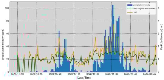 Figure 4 shows a heavy precipitation process on 28 June. The horizontal axis represents the precipitation process time, the left axis represents the precipitation intensity, and the right axis represents the particle diameter of the mass-weighted average diameter and the average volume diameter. The precipitation intensity value of this process shows a bimodal distribution. It can be seen that, when the precipitation intensity is not high early, late, and between the two peaks of precipitation, the curves of the mass-weighted average diameter and average volume diameter almost coincide, which are in good agreement with the precipitation intensity value. However, the performance of the average volume diameter in the heavy precipitationarea is better than that of the mass-weighted average diameter. The correlation coefficients between the mass-weighted average diameter and average volume diameter, and the precipitation intensity were 54.84% and 69.15%, respectively.