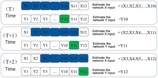 As shown in Figure 5, the X input of the estimation network keeps the ten sample sizes unchanged and slides on the time axis in turn. The Y input maintains the time corresponding to the last sample of the X input—that is, using the data from the previous hour to estimate the current time’s precipitation.