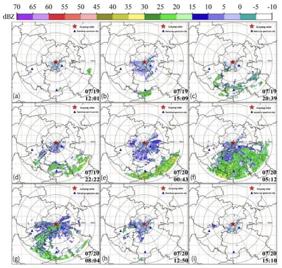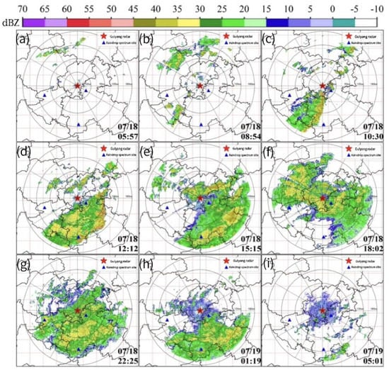 Radar echo of precipitation process on 18 July 2020: (a) 07/18 05:57, (b) 07/18 08:54, (c) 07/18 10:30, (d) 07/18 12:12, (e) 07/18 15:15, (f) 07/18 18:02, (g) 07/18 22:25, (h) 07/19 01:19, and (i) 07/19 05:01.