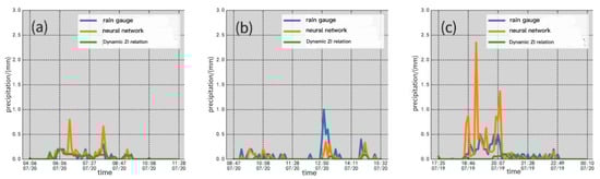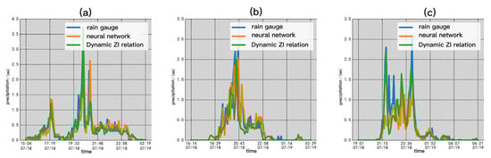 From the precipitation measured with the rain gauge, the rainfall estimated using the neural network, and the precipitation estimated using the dynamic Z-I relationship shown in Figure 11, along with the comprehensive evaluation index, it can be seen that the rainfall estimates made using the dynamic Z-I relationship method and the neural network method have a firm consistency with the measured rainfall. Still, the dynamic Z-I relationship is reflected in some weak precipitation processes, but the dynamic Z-I relationship did not reflect satisfactory effects in some weak precipitation processes, such as Puding (57808); the dynamic Z-I relationship of multiple inefficient precipitation processes after August in Luodian (57916) station also shows apparent underestimation, and a weak precipitation process on July 10 was overestimated. By examining the base data and radar echo map on 10 July, it is found that the radar detected a strong echo lasting about one hour before the automatic rainfall station detected the precipitation. Because the dynamic Z-I relationship was Z = 16 × I10 when the rainfall data of the rainfall station is 0, the strong echo in the period of 0 times the rainfall station data caused the weak precipitation process to be overestimated. The relative errors of Longli (57913), Puding (57808) and Luodian (57916) stations using dynamic Z-I relationships to estimate cumulative precipitation were −2.68%, −7.41% and −21.23%, respectively, and the relative errors estimated by neural networks were −4.25%, −11.35% and −8.68%. With regards to the cumulative precipitation of the Longli and Puding stations, the final relative error of the neural network is slightly worse than that of the dynamic Z-I relationship. Still, the neural network is better than the dynamic Z-I relationship in terms of the correlation coefficient index. Combined with Figure 11a, it can be found that the dynamic Z-I relationship shows a certain underestimation in several heavy precipitation processes. Still, it shows apparent overestimation in several weak precipitation processes in August, and finally offers a small cumulative error and low correlation coefficient. From Figure 11c, it can be obtained that dynamic Z-I is affected by the quality of radar detection data, and the estimation effect of stratomorph cloud precipitation is poor at a distance from the radar station, which is directly reflected in the cumulative precipitation error of −21.23% at Luodian (57916) station.