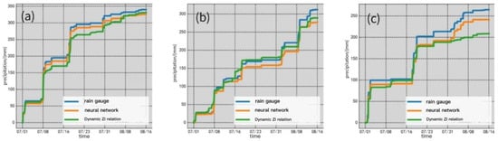 Finally, the neural network and the dynamic Z-I methods were used to estimate the total precipitation of the three stations for 45 days from 1 July 2020, to 16 August 2020, respectively. Calculating cumulative rainfall in an area can reflect the applicability of the estimation method and the universality of different types of precipitation. The cumulative precipitation of rain gauges at the Longli (57913), Puding (57808), and Luodian (57916) stations during the selected period were 340.0 mm, 312.0 mm, and 264.6 mm, respectively. The results are shown in Figure 11.