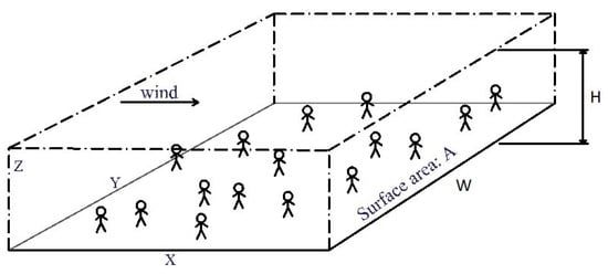 As discussed in the previous section, the first step in any model, whether indoor or outdoor, is to evaluate the concentration of the virions in inhaled air. The outdoor model that we developed previously [] is essentially a “box” model as described in chapter 5 of “Environmental Impact Assessment” [] and developed previously by numerous researchers [,,]. Box models are based on mass balance equations and are the simplest atmospheric models that can be used to evaluate the mean concentration of pollutants (molecules or particles) downwind of a source.