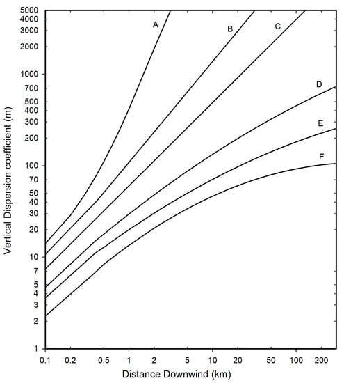 In Equations (8), (10), and (12), a key parameter is the value of , and therefore , as discussed at length by Rowe et al. [] in their Supplementary Materials. For strong winds, i.e., > 6 m/s at 10 m height and at nighttime or low solar insolation, the atmosphere can be considered as neutral in the so-called Pasquill–Gifford–Turner classification [,,], which means there is no tendency for enhancement of air turbulence (instability) or suppression (stability) through buoyancy effects. In fact, it is known that airborne pollutants emitted locally are transported and dispersed within the so-called atmospheric boundary layer (ABL: the tropospheric bottom layer), whose thickness is usually lower than one thousand meters [], except for strongly unstable atmospheres. At any distance from the source, an order of magnitude value of H versus x can be estimated using the vertical dispersion length used for Gaussian plumes and shown in Figure 2 [,].