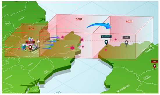 We consider two plausible targets in France, either the city of Dunkerque or the Lille agglomeration, with populations of 0.2 × 106 and 1.2 × 106 people, respectively. We assume that the wind direction is the same as the direct path between the source and the target, a dominant direction in wintertime, which roughly corresponds to a wind direction from the west/northwest (respectively 288 and 294 degrees). As before, we also assume a wind velocity of 30 km/h, which is only slightly higher than the mean wind velocity in February/early March []. Note again that both target areas have a width across the wind less than that of the source. Table 1 gathers the main characteristics of the three boxes as depicted in Figure 3. Table 2 summarizes the assumed values of various parameters leading to a statistical number of primary cases. Since this number appears to be a few units in the frame of our assumptions, it clearly reveals the potential for an infection being triggered through long-range transportation of airborne viruses.
