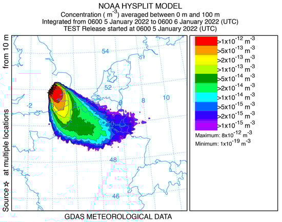 To determine if the box model assumptions were sufficiently realistic, a test calculation was performed using a three-dimensional particle transport and dispersion model. The HYSPLIT model [] was selected for the simulation using one-degree resolution, gridded global meteorological data available at three-hour intervals from the National Oceanic and Atmospheric Administration (NOAA). As noted earlier, west-to-east flow is common, and a 24 h period (beginning 0600 UTC 5 January 2022) with airflow from London to France was identified in the first week of data downloaded from the GDAS server []. The model was configured to be similar to the box model. A 40 km line of five-point sources, orthogonal to the wind direction, was set over central London with a total emission rate of one unit per hour for the 24 h simulation period. Air concentrations (unit mass per volume) were computed as a 24 h average on a 10 km resolution grid with a vertical depth of 100 m to represent the surface layer for human exposure. Particles were terminated after 12 h to constrain the downwind domain to France rather than all of Western Europe. The HYSPLIT result depicted in Figure 4 shows a broad region of concentrations of around 5 × 10−14 m−3 over northeastern France. Using the effective quantum production rate qeff value derived from Table 2, the unit emission HYSPLIT values (through the expression: NP × r × qeff × 24) yield a quantum concentration of 3.1 × 10−6 quantum m−3, which is very close to the upstream box model value of 2.1 × 10−6. Due to the line source configuration, lateral dispersion along the centerline would be negligible, and the concentration results would primarily depend upon the vertical mixing. An examination of the diagnostic vertical mass profile after 12 h (not shown) indicates that 94% of the mass was in the first 1200 m above ground and 99% was within the first 1500 m, consistent with the well-mixed box model assumptions.