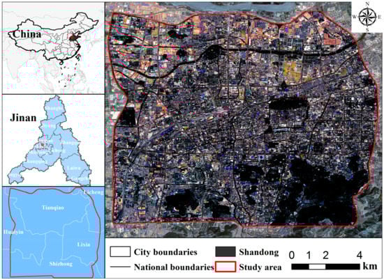 Jinan (36°01′–37°32′ N, 116°11′–117°44′ E) is located in the middle of the North China Plain, adjacent to the Yellow River Plain in the north, and surrounded by low mountains and hills in the south. The terrain is high in the south and low in the north, and the area has a warm temperate continental monsoon climate. Jinan is one of the hottest cities in China in summer. This research took the central urban area within the second ring road of Jinan as the study area (Figure 1), covering part of Licheng, Lixia, Shizhong, Huaiyin, and Tianqiao, with an area of about 143 km2. As the central area of Jinan’s urban construction and development, the urban area within the second ring road is greatly affected by heat island effects due to the rapid urban expansion, increasing agglomeration of the population, and limited space for the planning and development of construction. Therefore, choosing the area within the second ring road of Jinan as the research area has a strong research value and practical significance.