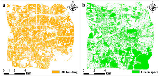 This study used Landsat 8 OLI/TIRS remote sensing image data from the geospatial data cloud (http://www.gscloud.cn/ (accessed on 20 May 2022)), with a spatial resolution of 30 m, a revisit period of 16 days, and cloud cover of less than 5%. The satellite image transit time is approximately 10:48 a.m. Four images, taken on 27 May, 15 August, 2 October, and 19 January in 2021 were selected to represent spring, summer, autumn, and winter in the study area, respectively. See Appendix A (Table A1) for detailed information on the images. The 3D buildings data and green space data (Figure 2) were derived from the water flow micromap (http://www.rivermap.cn/ (accessed on 20 May 2022)), and the data are vectors. The 3D buildings data include the buildings’ ground contours and floor information. Under the assumption that the height of each floor is 3 m, the total number of floors of each building was multiplied by 3 m to obtain the buildings’ heights. The green space data include information on the green spaces’ ground contours.