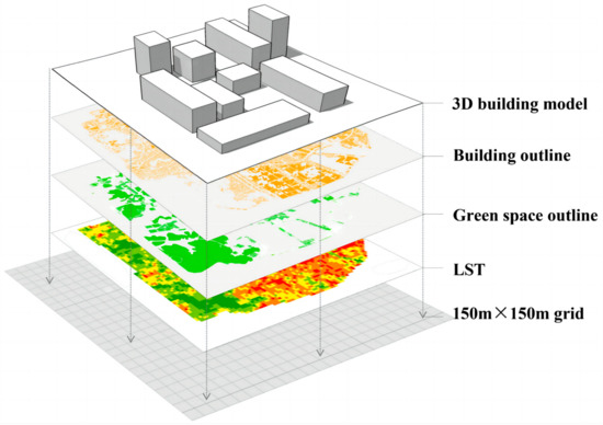 The multisource data used in the study had different spatial resolutions, so the appropriate way to standardize the data was to overlay them into a uniform regular grid. The patterns and spatial distribution of geographical research objects are scale-dependent. Under different spatial scales, the influence of 3D buildings and green spaces on LST may be different. If the scale is too small, the correlation analysis between the landscape index and LST will be divided into multiple grid correlations, while if the scale is too large, the detailed relationships of spatial features cannot be reflected. Therefore, a reasonable scale should be selected during the analysis. According to the conclusions on the scale effect of the surface’s thermal environment [39,40] and the resolution of the image data, 150 m was chosen as the appropriate spatial scale. Therefore, we chose 150 m as the spatial analysis scale. Firstly, this study used the ArcGIS fishing net tool to create a 150 m spatial scale fishing net to divide the research units. Secondly, we resampled the surface temperature data obtained from the Landsat 8 inversion to 150 m. Finally, we used the GIS spatial analysis method to overlay the surface temperature data, 3D building data, and urban green space data into a unified regular fishing net for subsequent quantitative analysis (Figure 3).