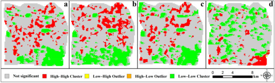 - Anselin, L. Local indicators of spatial association—LISA. Geogr. Anal. 1995, 27, 93–115. [Google Scholar] [CrossRef]