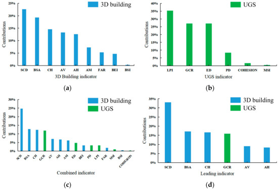 Contribution of indicators to LST: (a) 3D buildings, (b) green space, (c) all indicators combined, and (d) dominant indicators.