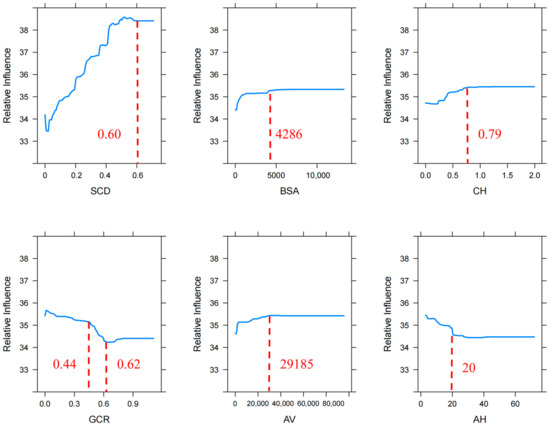The marginal utility analyzes the influence of independent variables on dependent variables by maintaining the mean value of variables. We use the BRT model to draw a marginal utility curve to further analyze the potential impact of the leading indicators on LST (Figure 7). Among the six leading indicators, SCD was positively correlated with LST, and LST increased significantly with an increase in SCD. When SCD < 60%, LST increased by about 0.38 °C for every 10% increase in SCD. When the SCD ratio exceeded 60%, the warming effect of SCD on LST was no longer significant. The warming effect of BSA on LST was obvious. LST increased by 0.18 °C for every 10% increase in BSA. When the BSA exceeded 4286 m2, changes in LST tended to be stable. GCR was negatively correlated with the changes in LST. When GCR > 44%, LST decreased significantly with an increase in GCR. When GCR > 62%, this provided a 1.1 °C cooling effect, but beyond this threshold, the cooling effect did not increase significantly. Among the six leading indicators, AH was the only 3D building indicator that had a negative impact on LST. When AH increased by 10%, this provided a cooling effect of 0.1 °C. When AH reached 20 m, the cooling effect was no longer significant. CH and AV were positively correlated with LST, and the warming effect was relatively small. Within the threshold range, LST increased by about 0.08 °C and 0.07 °C for every 10% increase in these factors.