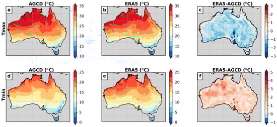 Annual mean biases in ERA5 compared to AGCD for mean Tmax and Tmin. (a) Mean Tmax from AGCD; (b) mean Tmax from ERA5; and (c) difference in mean Tmax between ERA5 and AGCD. (d–f) Same as (a–c) but for Tmin. Notice the different colorbar limits for Tmax and Tmin.