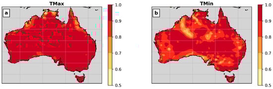 These patterns of the skill of simulated Tmax and Tmin from ERA5 are further demonstrated in the temporal correlations between ERA5 and AGCD. Figure 2 shows the temporal correlations of annual mean Tmax and Tmin between ERA5 and AGCD. Akin to Figure 1c,f, Tmin shows a widespread reduction in skill compared to Tmax. Correlations between the seasonal mean values are presented in Figure S4 in the Supplementary Information. The correlations for seasonal mean Tmax values are similar in magnitude to those for the annual means. However, correlations of the seasonal mean Tmin are worse than the annual mean across all seasons. Furthermore, the correlations of seasonal mean values (Figure S4) show a different variability than the biases of seasonal mean values (Figures S2 and S3). While Tmax shows the strongest biases for DJF (Figure S2c), the weakest correlations are evident for SON (Figure S4g). Although the worst seasonal Tmin biases as well as correlations are noted for JJA, all seasons show worse correlations than the annual mean correlations (Figure S4 compared to Figure S3).