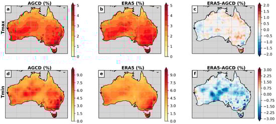 Coefficient of variation for annual mean Tmax and Tmin in ERA5 compared to AGCD. Coefficient of variation of annual mean Tmax values from (a) AGCD, (b) ERA5, and (c) difference between ERA5 and AGCD (d–f); same as (a–c) but for Tmin. Notice the different colorbar limits for Tmax and Tmin.