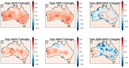 Decadal trends for Tmax in the top row and Tmin in the bottom row from AGCD (a,d), ERA5 (b,e), and the difference between ERA5 and AGCD (c,f).