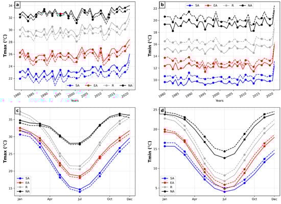 Inter-annual and monthly variability for the National Resource Management regions. (a) Inter-annual variability of Tmax; (b) inter-annual variability of Tmin; (c) monthly variability of Tmax; and (d) monthly variability of Tmin. Values from AGCD in solid lines and those from ERA5 in dashed lines for Southern Australia (SA—blue), Eastern Australia (EA—red), Rangeland (R—grey), and Northern Australia (NA—black).