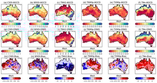 Annual mean biases in six temperature-based climate extreme indices. Mean values from AGCD in the top row, ERA5 in the second row, and biases in the third row. Different columns for different indices: (a,g,m) Cold Spell Duration Indicator (CSDI, in days); (b,h,n) Warm Spell Duration Indicator (WSDI, in days); (c,i,o) Number of days when the minimum temperature is below 2 °C (TNlt2, in days); (d,j,p) Number of warm nights (TN90p, in days); (e,k,q) Number of warm days (Tx90p, in days); (f,l,r) Coldest daily minimum temperature (TNn, in °C).
